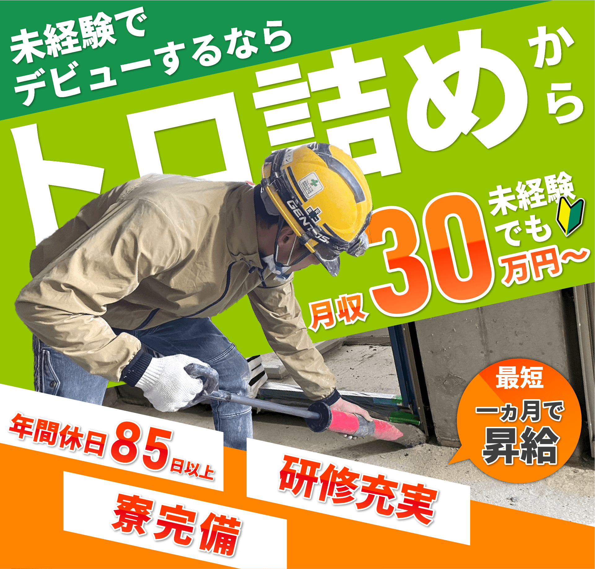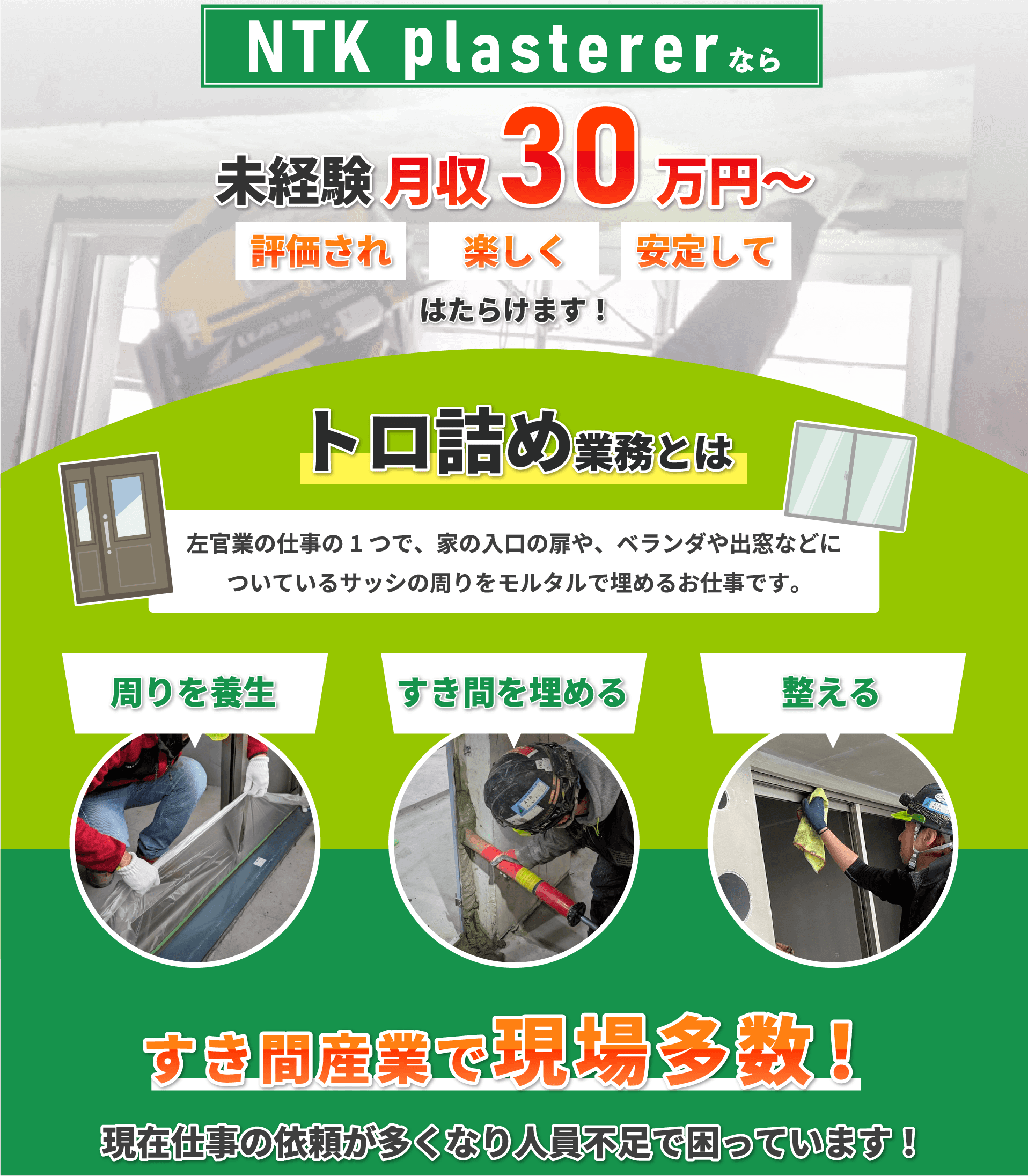 | 業務内容 | 仕上工事関連 [左官トロ詰め業務] 窓や家の入口の周りを埋める簡単なお仕事です |