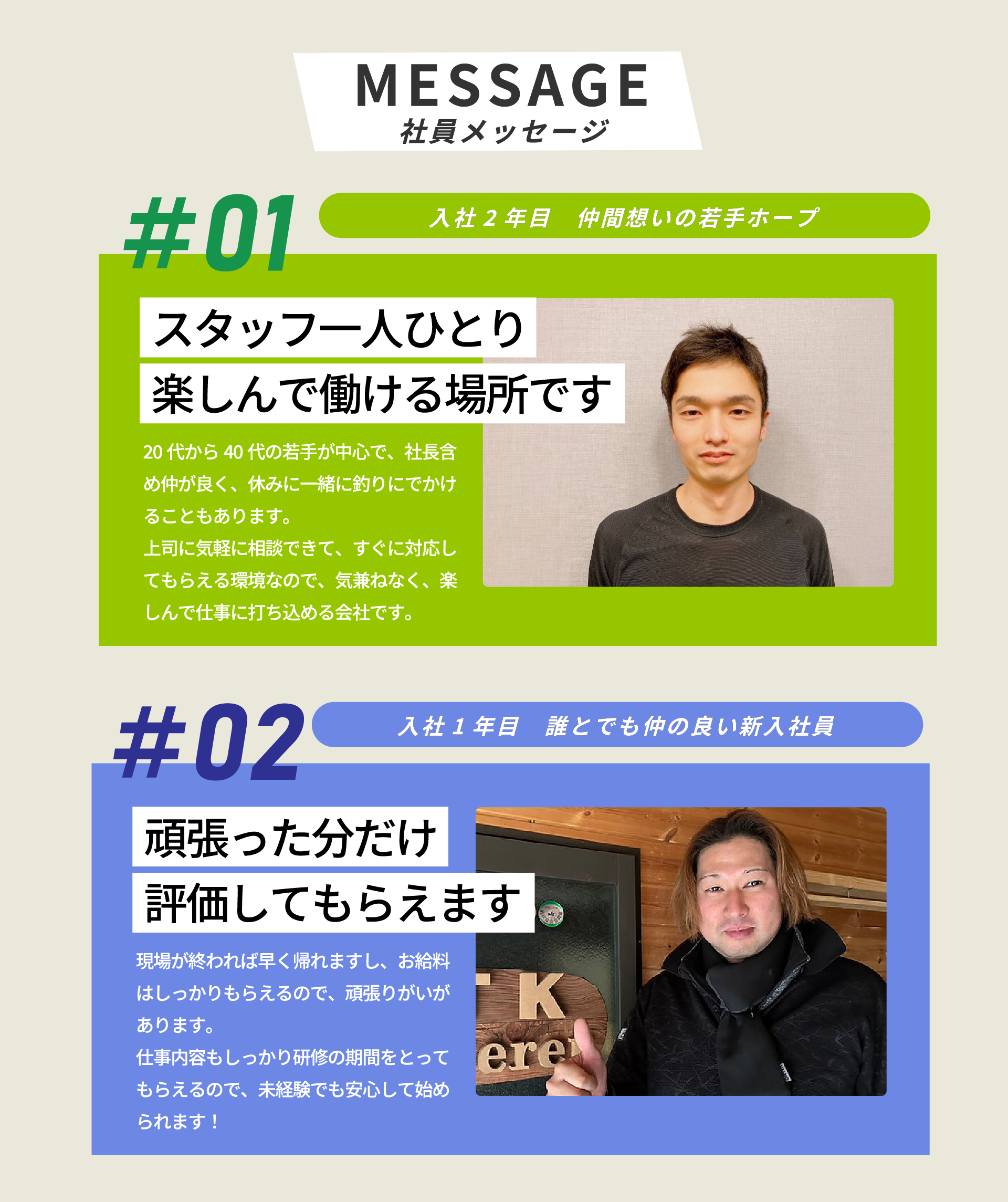 | 福利厚生 | 社会保険完備 交通費支給(事務所から現場) 賞与年2回(会社規定による) 昇給あり 資格支援制度あり 残業手当あり 家族手当あり 寮完備 有給休暇取得あり |